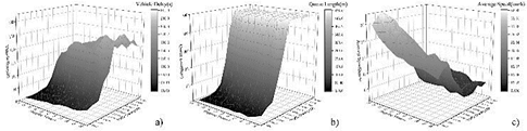Figure 9: Evaluation Indicators change with TF and NPS: a) Vehicle Delay; b) Queue Length; b) Average Speed.