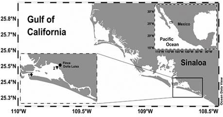 Water samples were collected at two sites (reservoir and pond) within the Finca Doña Luisa S. de R.L. de C.V. shrimp farm and two sites (northern mouth and El Tortugón estuary) in the Macapule lagoon. The lagoon sampling stations were separated ~9 km from each other and 2.1 km and 10.8 km from the shrimp farm, respectively (Fig. 1).
