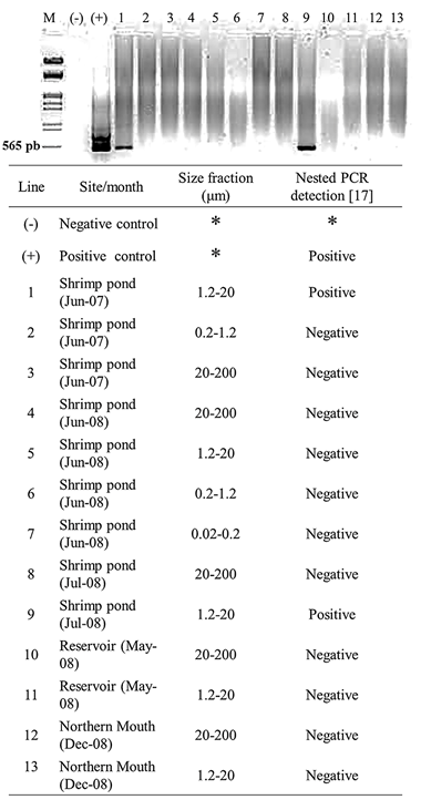 The present study aims to provide local evidence of the potential route of WSSV transport between shrimp ponds and its contiguous coastal system from the northern State of Sinaloa, Mexico, over a time series of viral detections on size-fractionated seston samples collected during an infectious event in June 2007 and from December 2007 to December 2008, analyzed through molecular testing based on nested, and real-time PCR assays. Viral concentration, in terms of WSSV copy number per milliliter, was estimated in the positive DNA extracts from the filtered seawater samples as an indicator of the detection limit, i.e., the minimum number of viral DNA copies in seawater detected with the methods used.