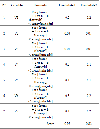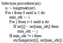 Having the variables established, we proceed to store the input data in the variables V1, V2, V3, V4, V5, V6, V7. The entered variables transformed into quantitative data perform a procedure called selection that takes as input an arr array. The procedure implements the selection algorithm to sort the array in ascending order. A Para loop is used to iterate through the array indices, from 0 to n-1, where n is the length of the array.