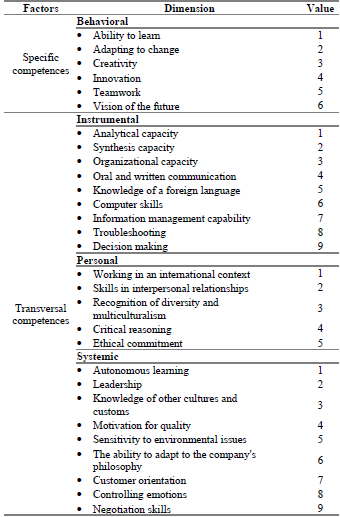 The input variables used to perform the recommendation of applicants are detailed in Table 1 where they are divided into factors, each factor has its corresponding dimensions, the factors and dimensions have their respective weights that are used to convert from qualitative to quantitative data these data will be taken using the competency-based method.