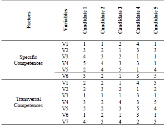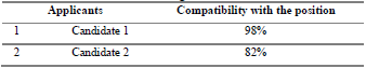 The input data is obtained at the time of registration of the applicant when answering the questionnaire, these data will be used for the calculation of distances in the selection algorithm. Table 4 shows the data entered by 5 candidates for the position of administrator along with their numerical values.
