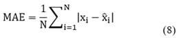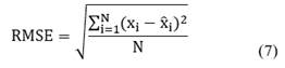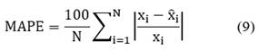 RMSE es la raíz del error cuadrático medio (ver eq. (7)), es una métrica estadística utilizada para evaluar la precisión de los modelos de regresión o para medir la magnitud promedio de los residuos entre los valores predichos y reales. El error medio absoluto (MAE) dado por la eq. (8) determina el promedio del error absoluto, es más tolerante a errores mayores que las métricas anteriores [23]. La eq. (9) muestra el porcentaje de error medio absoluto (MAPE) métrica estadística comúnmente utilizada para evaluar precisión de la predicción de un modelo [24].
