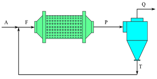 El circuito se compone de una corriente de alimento fresco (A), alimento al molino (F), descarga del molino (P) y las corrientes de rechazo (T) y rebalse (Q), como se presenta en la Fig. 1 En condiciones de estado estacionario se tiene que la cantidad de alimento fresco (A) es igual a la cantidad de material que se descarga en el rebalse (Q).