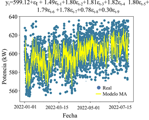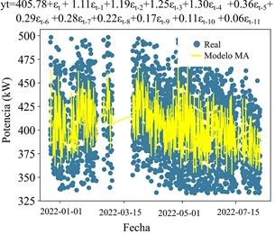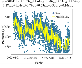 La media móvil se aplica a los datos continuos de los molinos, excluyendo aquellos donde los molinos cargan y descargan, así como durante el apagado de éstos. Se usa una ventana de 8 horas, correspondiente a un turno laboral en Colombia, que minimiza los errores del modelo según los predictores de la sección 2.3.2. Esto permite respuestas rápidas ante cambios en los datos sin perder información relevante para determinar la potencia activa de los motores de los molinos. La selección de este modelo se basa en su capacidad para abordar la estacionalidad en los datos, evaluada mediante la prueba Dickey-Fuller. Si el valor-p es menor que 0.05, se concluye que la serie de tiempo es estacionaria, indicando ausencia de patrones repetitivos influenciados por el tiempo [20-22]. El modelo de media móvil de orden q MA(q), definido por la eq. (6) se emplea para determinar la potencia activa pasada y futura de los motores de los molinos, útil tanto para valores presentes como para predicciones a corto plazo.