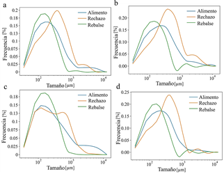 Figura 7: Distribución de tamaño de partícula del alimento, rechazo y rebalse asociadas con a. M1, b. M2, c. M3, d.M4.