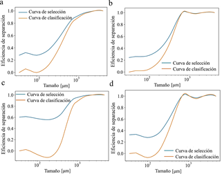 Se determinan las curvas de partición que establecen la probabilidad de que la corriente de alimentación al hidrociclón se vaya por la corriente de rechazo o de rebalse. Para esto se midieron las corrientes de alimentación, recazo y rebalse y se estimaron los parámetros de selectividad y clasificación. Con la información anterior se obtuvo el cortocircuito (CC), el tamaño de corte real (D50) y corregido (D50C), el índice de claridad (SI) y el efecto Fish-Hook [9,18].