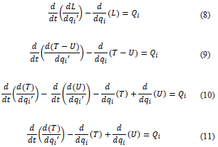 Since the eqs. 8 to 11 are the summary of the Lagrange analysis owing to validate the energy transmission through the robotic system. In which, "L" is the Lagrange function, "T" is the kinetic energy, "U" is the potential energy, and "q" is the coordinate axis, as well as "Q" is the external force, and "i". [4,5,7].