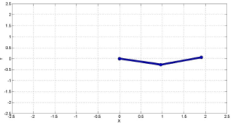 After to organize the described equations and analysis from paragraphs above, it was prepared an adaptive algorithm in order to evaluate the optimal energy transmission of the studied robotic arms, and the following Fig. 3 shows a result of the simulated displacement on the axis X and Y. The scale was 10 cm for the displacement of the robotic arm over a plane surface "XY".