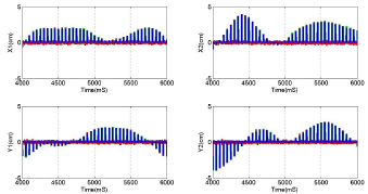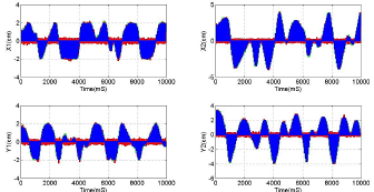 The green color curve for the 4 subfigures of the following figure is the data achieved by the designed smart sensors, the blue color curve is the theoretical trajectory analyzed by the previous mathematical models described in chapters above, as well as the red color curve is the data measured by the traditional electromechanical sensors.