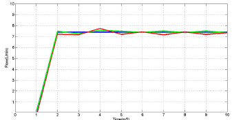 The following Fig. 9 shows the dynamic response of the carrier energy for the designed robotic arm, which was air. Therefore, airflow was controlled as part of the control volume (carrier energy) to give the movement effect for the robotic system. The blue color curve is the theoretical model of the airflow as part of a step response over the robotic arm, the red color curve was the data measured by a traditional electro mechanic sensor, and the green color curve is the airflow measured by the designed smart sensor.