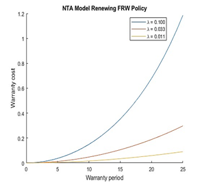 Fig. 6 depicts the warranty cost for a renewing free replacement warranty [4] for various warranty periods by varying parameter λ. As predicted, the value of λ that produces the lowest reliability or largest hazard function, as illustrated in Fig.6, produces the highest warranty costs.