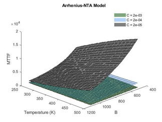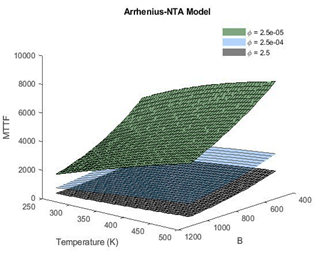As in Corollary 4, the MTTF of the Arrhenius-NTA is not analytically available. Figs. 10 and 11 show the numerically solved mean time to failure (MTTF) of the Arrhnenius-NTA model.