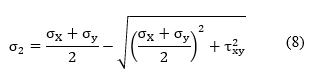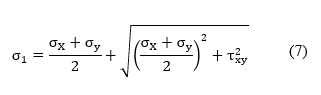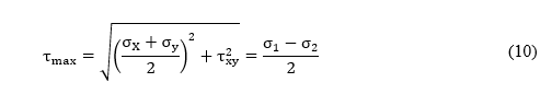 Think about the stressed-out plane condition, where only σx, σy and τxy act. Assume that we are aware of these coordinate stresses. Finding the stress state in rotating configurations is the goal in this situation. i.e., determine the major stressors σ1, σ2 [34]. Let be θ the angle where the main stresses are operating between the original coordinate system and the rotated system e.g. σ1, σ2 and τmax [35]. Based on the normal stresses σx, σy and τxy, the major stressors are predicted [36].