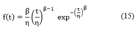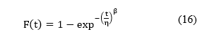 In this section, the Weibull model used in fatigue analysis is presented along with the theoretical basis and characterization definitions. Due to its versatility, the Weibull distribution is often used in reliability and service life studies [42]. Depending on the value of the Weibull parameter, the Weibull distribution can be used to describe different life behaviors. The values of the shape and scale parameters have a strong influence on the distribution characteristics [43]. The probability density function of the Weibull distribution is given by.