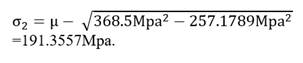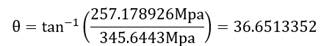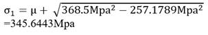 In such a way the principal stresses σ1 and σ2 are equal to 345.6443Mpa, and 191.3557Mpa, respectively.