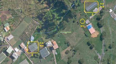 Figura 1: Ubicación del sitio seleccionado para la implementación. Nota. Panorámica general de la zona de estudio: 1: Invernadero No.1; 2: Invernadero No.2; N-A: Nodo tipo A; N-B: Nodo tipo B; M-E: Estación meteorológica. Coordenadas: 6°17’42.68’’ N 75°39’25.99’’ O