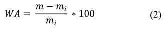 Where: WA is the water absorption 24h (%); mi is the initial mass of the specimen (g) and mf is the final mass of the specimen (g).