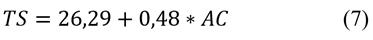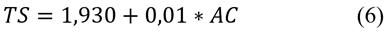 Where: TS is the thickness swelling 24h (%). The correlation between the TS and the ash content is 3,64%. The thickness swelling did not exhibit statistical variation due to the high standard deviation. However, it showed a trend of reduction with an increase in the amount of ashes.