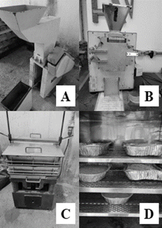 Figure 1: Production of composites, where (a) Drum chipper. (b) Wiley mill. (c) Set of vibrating sieves. (d) Oven drying. (e) Mixing of materials. (f) Molded cylindrical composites. (g) Molded prismatic composites. (h) Finished composites.
