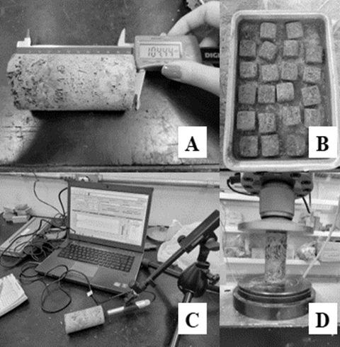 Figure 2: Physical-mechanical tests, where (a) Measurement of the test piece; (b) Test specimens immersed in water; (c) Non-destructive test; (d) Compression test.