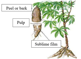 Cassava is divided into sweet and bitter cassava groups; this depends on the hydrocyanic acid content of the roots. Generally, the roots contain a glucose-cyanogen known as linamarin, which releases hydrocyanic acid when activated by the enzyme linamarin. The pulp contains a smaller amount of hydrocyanic acid than the peel. It is important to mention that the level of hydrocyanic acid is found in greater quantities in bitter cassavas and small quantities in sweet cassavas, and its presence varies according to the plant's physiological state and the humidity and fertility conditions of the soil [9]. As shown in Fig. 1, cassava is a perennial, woody, semi-shrub plant of variable size that reaches 1 to 4 meters in height, consisting of aerial and underground parts. The aerial part is made up of the stem (maximum height of 100 cm), leaves (length between approximately 14 and 17 cm), flowers, and fruits; while the underground part is composed of roots and radicals, although the roots are made up of an external part (bark or shell) corresponding to 12-20% of the root and the internal or central part (pulp) [16].