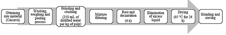 Fig. 2 shows the process of obtaining cassava starch, where initially, the root was washed, weighed, and peeled. When peeling, the rind and pulp were separated. Following this, it was grated, ground, or crushed with 350 mL of distilled water per kilogram of pulp to release the starch granules contained in the cells. Once the size was reduced, the mixture obtained was filtered through a filter, separating the fibers and impurities. Subsequently, a liter of water was added to the fiber obtained and filtered again; this step was carried out twice. The liquid obtained was left to stand in beakers for 4 h in sedimentation, where granules of various sizes settled to the bottom. Finally, the starch obtained was dried at 45°C for 24 h and then ground and sieved [28]. Note that, according to the FAO Agricultural Services Bulletin, the cassava starch extraction method which includes the following stages: collection, washing, shearing, grating and roots, extraction, sedimentation, drying, and adaptation; the latter includes the crushing, sieving, and packaging processes [16].