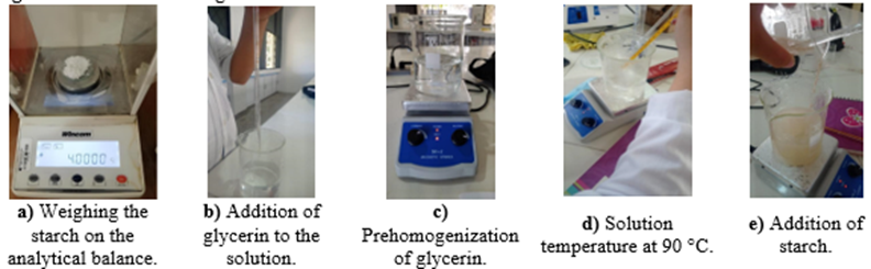 For the preparation of biodegradable films of cassava starch (pulp or commercial), the Solvent casting method was used, highlighting that the concentration of starch in the solution was 4% w/v and glycerol was 30% w/w, as shown in Fig. 3. Glycerin was pre-homogenized with distilled water at room temperature for 10 min with the help of a magnetic stirrer at 200 RPM. Note that the disadvantages of starches lie in their low tensile strength, deformation at the break, and, therefore, the functionality of the film as a function of time. The high intermolecular interaction can be reduced between the polymer chains of starch and plasticizers such as water, urea, glycerol, and sorbitol, among others, must be used to reduce its fragility. Also, these are hydrophilic, which increases the polymeric material's interaction. The above requires finding an alternative mixture, making it necessary to use a less hydrophilic biopolymer such as chitosan, whose function will reduce the hydrophilic character (water vapor) permeability of the biodegradable film obtained. However, its use is limited due to the high cost, so polyethylene-based films are still used in underdeveloped countries like Colombia.
