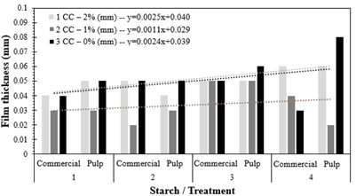 For the thickness determination, the differences obtained between the films of commercial starch and pulp for the 0% chitosan concentration was 0.017 mm; for the 1% chitosan concentration, it was 0.002 mm, and for the 2% chitosan concentration, there was no difference. The data was obtained from the differences between Table 9, shown below. For the density’s determination, differences were obtained between the commercial starch films and pulp; for the 0% chitosan concentration was 0.01 g/cm3, for the 1% chitosan concentration, it was 0.01 g/cm3, and for the 2% chitosan concentration it was 0.02 g/cm3.