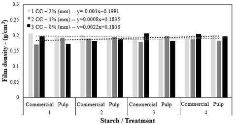 Using the casting method, the mixture of cassava starch (pulp or commercial) with glycerol and chitosan generates a biofilm with good properties. Within each type of starch used, the different treatments show variations in the density and thickness of the films. Some treatments may be more sensitive to chitosan concentration than others, highlighting the importance of the interaction between treatment and chitosan concentration. Likewise, a trend equation was established for each one that governs the behavior of each starch concerning the experimental conditions with the addition of chitosan, evidencing a high correlation coefficient (R2) between the measured variables and the treatments, considering the value of the slope of the equation.
