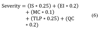 Now, the probability of failure was also assigned a range between 1 and 3, where 1 meant likely to fail in 6 months or more and 3 meant likely to fail between 1 day and one month, as indicated in the criticality matrix. This value was assigned based on the corrective history of the equipment, multiplied by the severity equation (Equation 1) and the severity rating of the equipment failure was obtained, as indicated below: