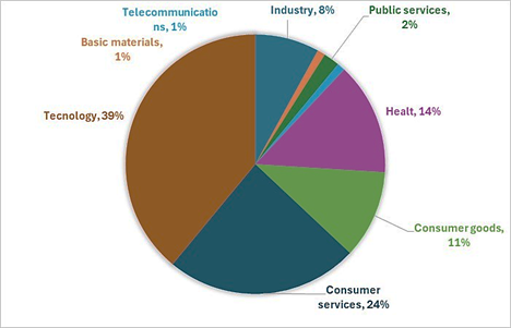 The technology Nasdaq-100 (NDX) is one of the three most representative stock indexes of the North American stock market, along with the SP500 and the Dow Jones. It brings together 100 of the largest non-financial companies in terms of market capitalization, both domestic and international [19]. No company in the index can have a weighting of more than 24%. The Nasdaq-100 is an index concentrated in the technology sector and it is there where the world's largest companies shine, it is also integrated by other large industries such as healthcare and consumer services. It is the world's fastest growing stock index by large capitalization, and since the 2008 crisis it has outperformed the SP500 index with higher annual returns and volatility (Nasdaq website). Observing that technology presents accelerated growth in the world and that its influence on companies is being decisive in obtaining better results and confirming through volatility calculations, the future of the Nasdaq-100 index is chosen to develop this research. Fig. 1 shows the composition of the Nasdaq-100 index by industry, a marked participation of technology companies is evident, which currently weigh 39%, and also shows an outstanding collaboration of the companies that make up the technology industries such as consumer services, health and consumer goods with weights of 24%, 14% and 11% respectively.