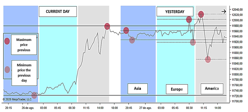 Identification and marking on the chart of the trading zones, which correspond to: the maximum and minimum price of the most recent Asian, European and American sessions, as well as the highest and lowest price of the trading day of the immediately previous day.