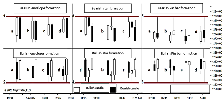 The most influential characteristic for identifying an adequate candle formation is its dimension or length, it means that this aspect is decisive for the validity of rule three. In general terms, the triggers are patterns that are characterized by outstand due to their size with respect to the preceding candles, when they do not stand out they are considered invalid. The study proposes formations with variants for the two directions that a market can take, when reference is made with respect to a bullish pattern it is indicated that the direction that is intended to be projected is ascending and the opposite is the case in a negative one. This document present three types of patterns: Envelope, Star and Pin Bar.