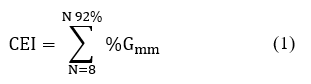 Table 5 presents the numerical results of each index. A low CEI indicates a better workability in the mix, but a value that is too low means a tender mix that should be avoided [16] and higher CEI values indicate that they require more energy to be compacted during the construction process, that is, a greater number of roller passes. On the other hand, a high TCI is preferable in asphalt mixtures due to its ability to support more vehicle loads and prolong its useful life; it requires more compaction to achieve 4% voids with air [17]. An ideal asphalt mix would be one that has a low CEI and high TCI, which would be easier to compact during construction and difficult to compact under traffic loads.