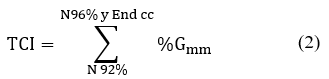 The M-0 mix with the gyration number eight of the SGC reached 86.2% of Gmm, while the M-50 mix for the same number of gyrations reached 85.5% of G Gmm. Likewise, to reach 92% of Gmm (Av=8%), the M-0 mix needed 32 gyrations of SGC and the M-50 mix needed 42 gyrations, from which the CEI values for each mix result. In the case of TCI, the M-0 mix needed 95 gyrations to reach 96% of the Gmm (Av=4%) and the M-50 mix needed 104 gyrations. Likewise, the maximum density in the SGC, the M-0 mixture was obtained at 115 gyrations for a percentage of voids with air of 3.61% and the M-50 mixture with 120 gyrations, a percentage of voids of 3.51% was obtained, as illustrated in Fig. 5a.