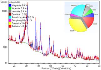 BFD analysis shows compounds rich in iron and magnesium. The BFD had iron hydroxides (Fe(OH)2), evidencing water exposure with its ongoing reaction. There are also forsterite-type magnesium silicates (Mg2SiO4) generated at high temperatures, which present calcium and aluminum silicates such as prehnite (Ca2Al(Si3Al)O10(OH)2), Goethite (α-Fe3+O(OH)) which is formed under oxidizing conditions as a product of the weathering of iron-bearing minerals.