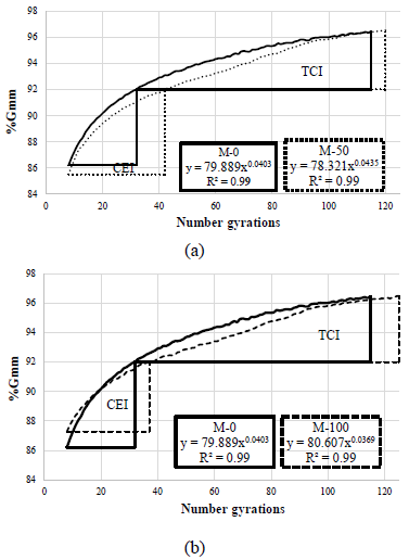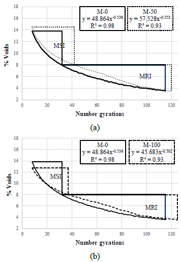 To determine the MSI and MRI indices, the compaction graphs (number of gyrations Vs. % Av) were prepared as seen in Fig. 6, which illustrates the concept of these indices. Fig. 6a shows the comparison of the indices of the base mix (M-0) and the M-50; in the same way, Fig. 6b illustrates the difference of the indices of the base mix (M-0) and the M- 100.