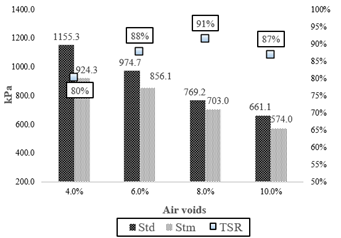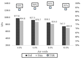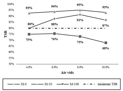 Fig. 7 shows the tensile strength values of the conditioned and unconditioned specimens, as well as the variation for each percentage of voids with air in the conventional M-0 mixture. As expected, the tensile strength of the conditioned specimens is lower than those obtained in the unconditioned ones, and the tensile strength decreases at a higher percentage of voids. However, the indirect TSR for all cases meets the minimum requirement of 80%, finding the highest value for 8% voids with air.