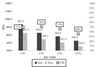 According to most specifications, the tensile strength ratio (TSR) must be greater than 80% to guarantee that the asphalt mix will not be further affected by the presence of water.
