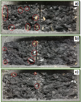 In the case of the conditioned test tubes of the M-50 mix, Fig. 11b, there was a smaller failure surface associated with a loss of adhesion between the aggregate and the asphalt and the greater failure surface was related to a reduction in asphalt cohesive force. Fig. 11c shows the conditioned specimen of the M-100 mix. There are few aggregates without an asphalt coating, which indicates that the failure due to adhesion loss decreased remarkably and the largest surface presents a black color, which indicates the loss in the cohesive strength of the asphalt [24][25].