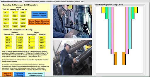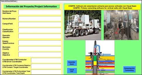 Fig. 2 shows the main cover of the CEMPRI software named: “Datos del Pozo/Well Data”, requesting the following information: name, number, location, placement, and classification of the well. Additionally, the name of the engineer or technician responsible for designing the well is also required.