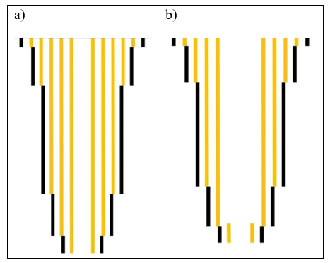 Fig. 3 shows the wellbore diagrams composed of the wellbore, casing, and liner (a short pipe that does not extend back to the wellhead and generally is suspended or anchored), respectively. The first case corresponds to the wellbore with five casing pipes and the second a wellbore with four pipes and a liner. The black lines represent the walls of the formations, and the yellow lines are the pipes or liner (the last pair of yellow lines, as appropriate to the design); the distance between each pair of parallel and yellow lines corresponds to the diameter of the wellbore and the outer and inner diameter of each pipe.