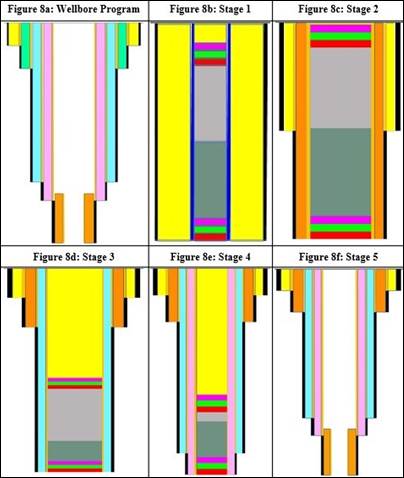The fifth stage corresponds to Figure 8f, where a cemented casing (liner) is observed. This pipe is anchored at a shallower depth than the last pipe, depending on the overlap length between the last pipe and the liner.