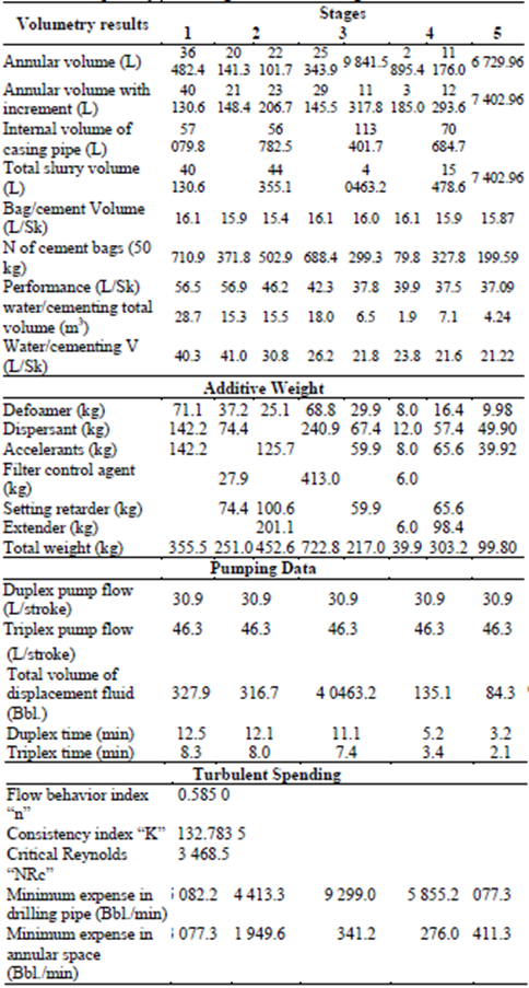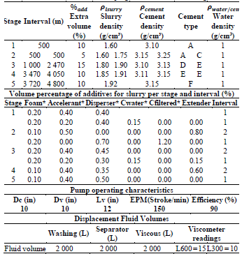 It is important to note that the physical unit of the additives that make up the slurry is the percentage symbol (%) [34]. Chaudhry [35] presents a diagram of the pipe and wellbore for each stage of the process but does not include a wellbore diagram or graphs showing the pumping and distribution of different types and volumes of fluids used for primary cementing.