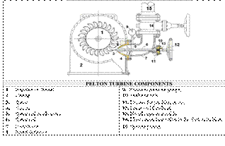 Fig. 4 shows the Pelton turbine components that directly intervene in the transformation of hydraulic energy into mechanical energy, including the following ?αμπ;#091;4?αμπ;#093;: 1) Impeller or Wheel, 2) Casing, 3) Lance, 4) Mouthpiece, among others.