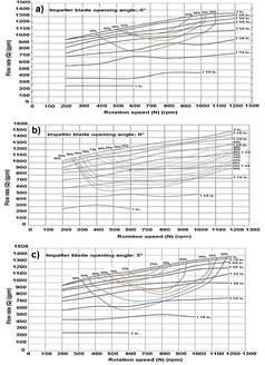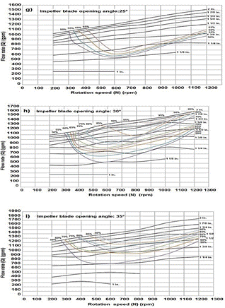 When analyzing the curves at 5º opening of the impeller (Fig. 6c), it is observed that the performance hills start and end at an distributor opening of 2 in, unlike the curves at 35º (Fig. 8i) where all the performance hills were evaluated at a rotation speed of 1200 rpm, it is graphically observed that they do not reach 1 3/4 in. This is why it is concluded that at 35º (Fig. 8) the system behaves more efficiently than with an opening of 5º (Fig. 6).