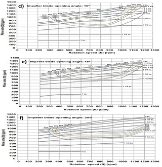The curves with opening angles of the impeller of 10º (Fig. 7), 15º (Fig. 7e) and 20º (Fig. 7f) have efficiency hills of up to 80%, the curves at 10º and 15º (Fig.7) have very similar hills, however the difference is more notable for the curve of 80% performance since it could be observed that at lower flow rates of 1200 gpm at 15º (Fig. 7) this performance is not obtained, instead at 10º it varies between 1300 gpm and 1100 gpm being able to observe graphically how the curve closes due to that the values at this performance do not reach the line with a 2 in manifold angle opening. It should be noted that at higher turning speeds and lower distributor opening the system with an opening of 20º is more efficient than with openings of 10º and 15º (Fig. 7).
