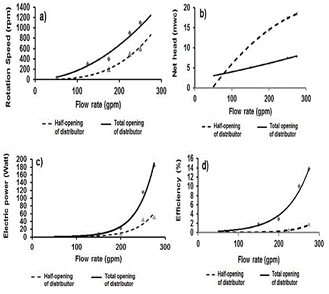 Fig. 9a shows the increase in the speed of rotation with increasing the input flow to the turbine, two curves are shown in the same graph, and each one corresponds to an opening value of the input distributor. The increase in the rotation speed is generated because the higher the input flow, the greater the energy that is provided to the turbine and this converts it into motive energy.