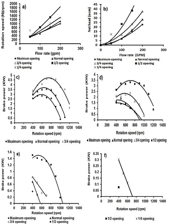 Figure 10: a) Flow rate against rotation speed of the Pelton turbine system of the UC-Hydraulic Laboratory, b) Flow rate against net head curve of the Pelton turbine system of the UC-Hydraulic Laboratory, c) Rotation speed against brake power under a flow rate of 200 gpm, d) Rotation speed against brake power under a flow rate of 150 gpm, e) Rotation speed against brake power under a flow rate of 100 gpm, f) Rotation speed against brake power under a flow rate of 50 gpm.